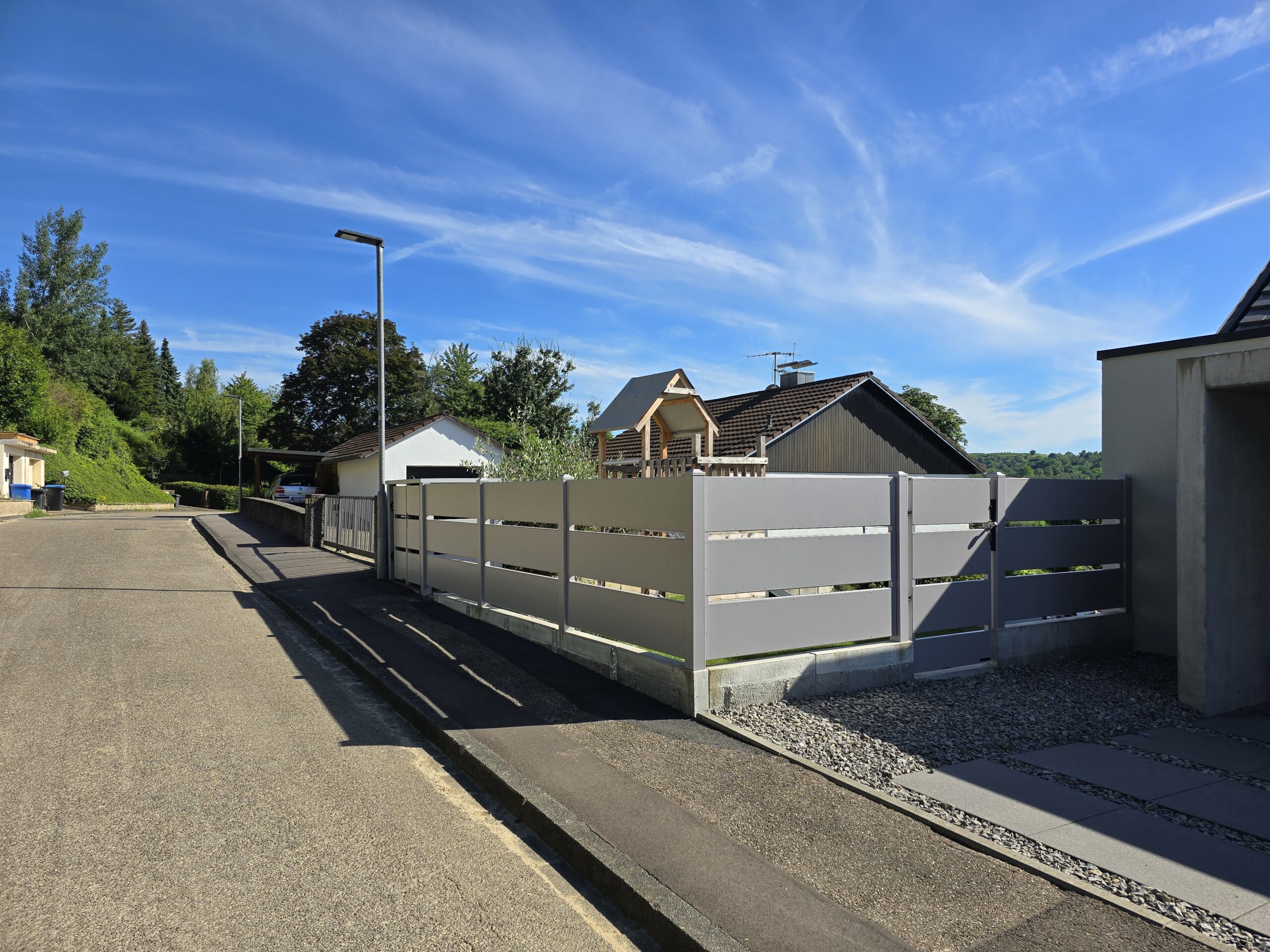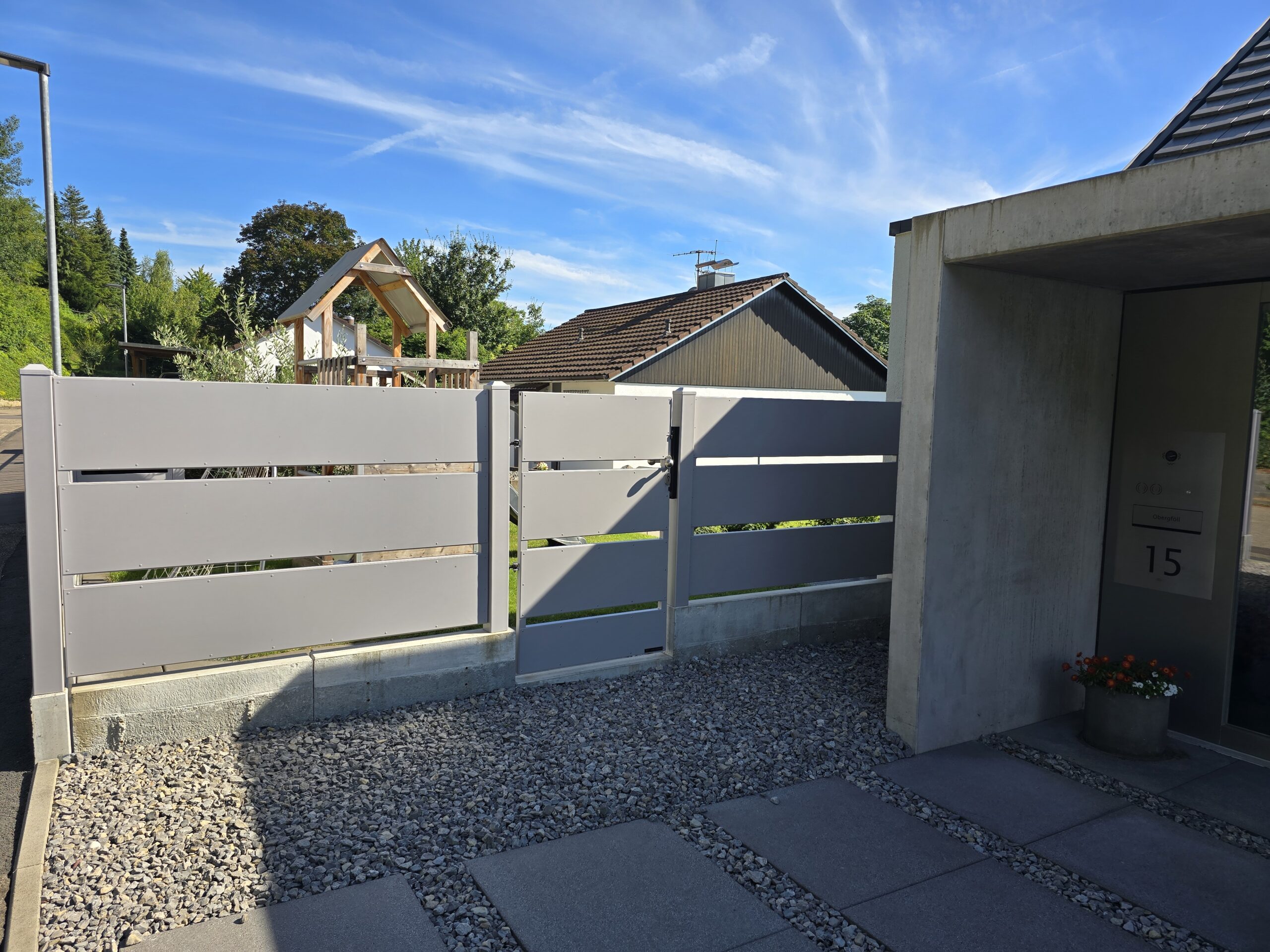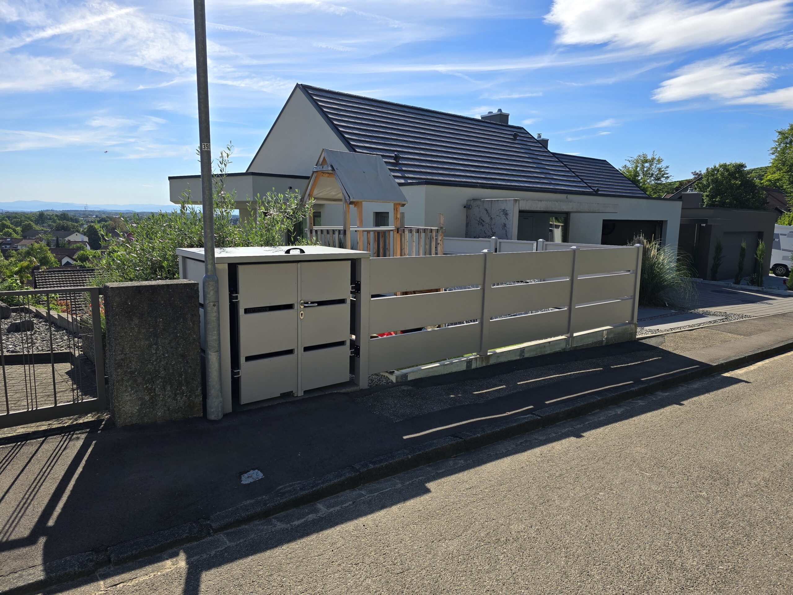 Moderne zaunsystem mit Gartentor und passende Müllbox
